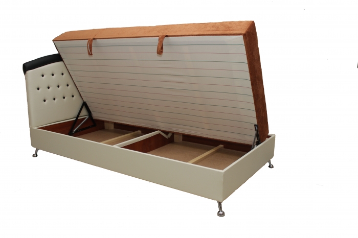 Кровать предназначена для обстановки бытовых помещений, для отдыха. Для кровати характерны комфортабельность, удобство в эксплуатации и соответствие современным требованиям эстетики. Для изготовления кровати используется древесина хвойных пород, фанера, ДВП, пенополиуретан эластичный облицован мебельной тканью.Основу матраца составляет пружинный блок, изготовленный из стали. В кровати имеется отделение для хранения постельных принадлежностей. Обивочный материал - по желанию заказчика.