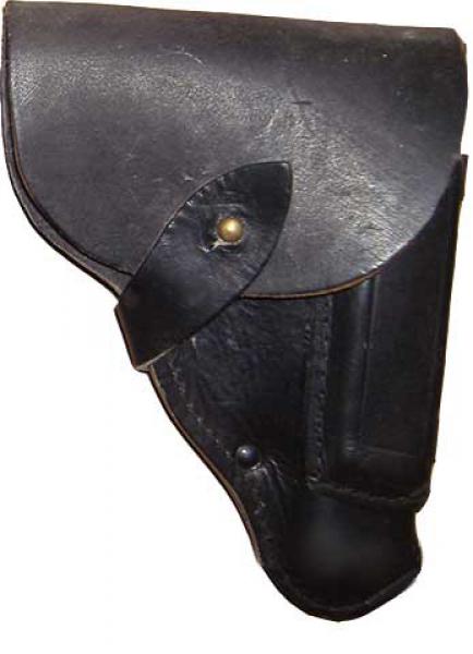 Кобура кожаная для пистолета ПМ предназначена для ношения и хранения пистолета, запасного магазина и протирки. Состоит из корпуса, крышки, кармана для запасного магазина, застежки, петель для протирки.