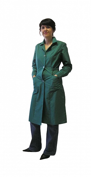 Халат женский полуприлегающего силуэта с застежкой на пуговицы. По переду и спинке рельефные швы. На деталях переда боковые накладные карманы, объем по талии регулируется поясом, завязывающимся на спинке. Рукава втачные с манжетами. Воротник отложной.
